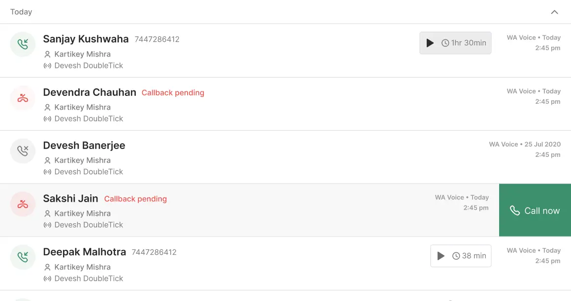 Track every interaction with detailed call logs. Instantly review missed, declined, and completed calls - filter by agent, WABA, date, or tags.
