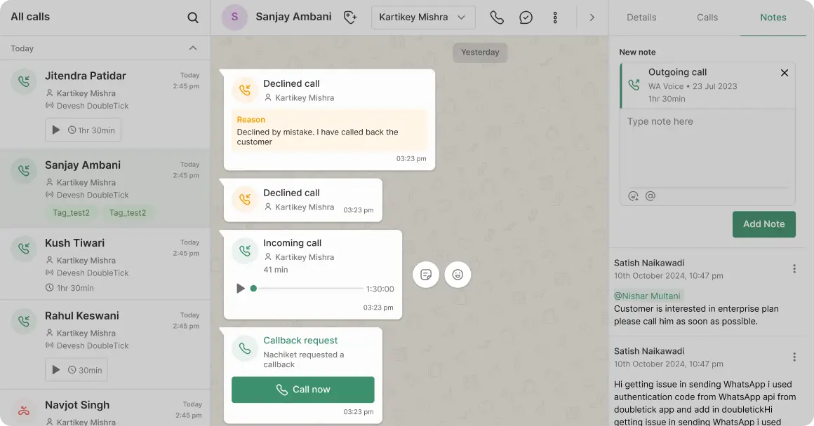 Every WhatsApp call is automatically recorded and stored with the customer conversation, giving teams a single source of truth.